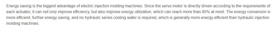 2. Une vitesse d’injection relativement élevée peut raccourcir le cycle de moulage. Pendant ce temps, les machines entièrement électriques DKM sont économes en énergie et consomment peu d’énergie, ce qui contribue à réduire les coûts de production.