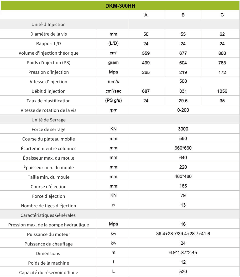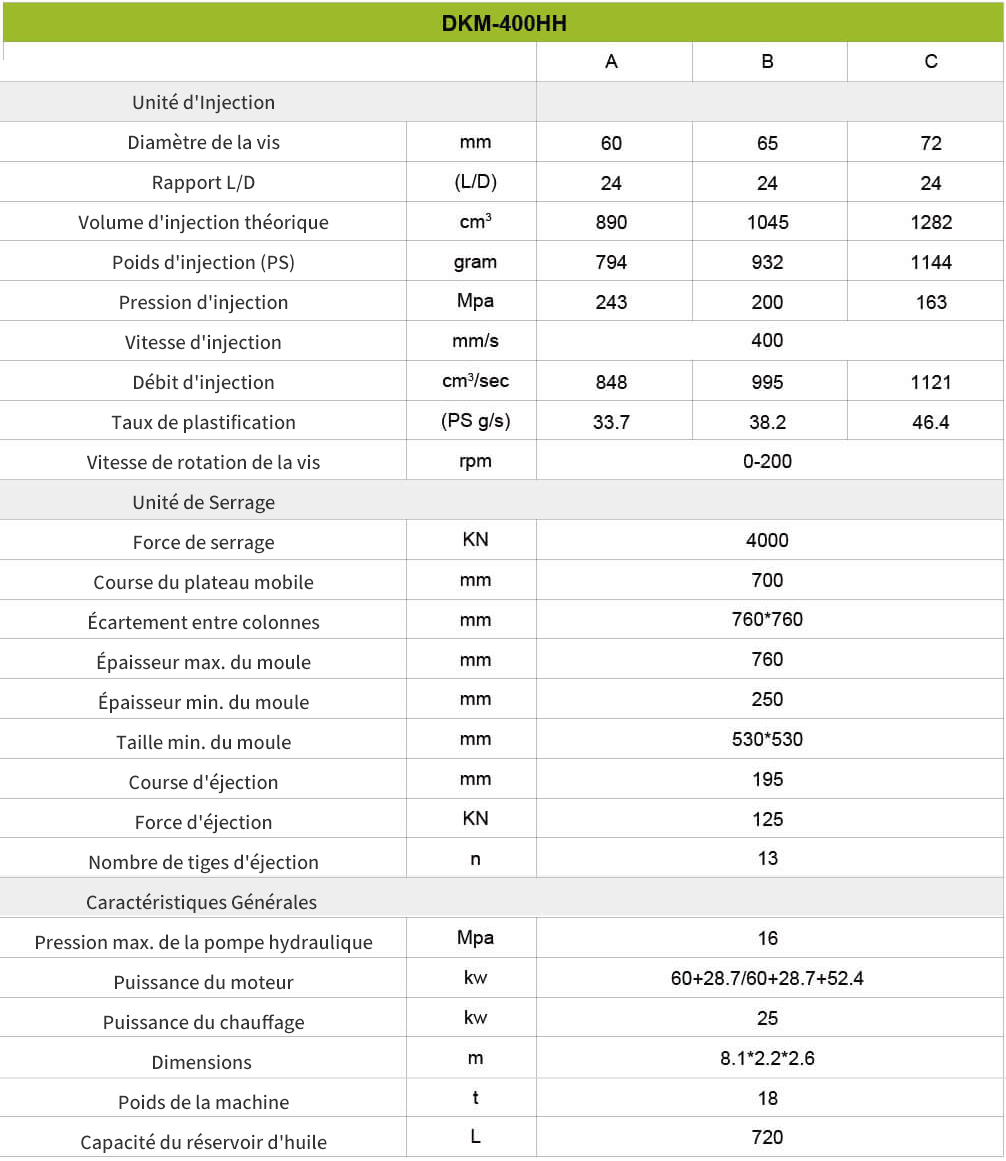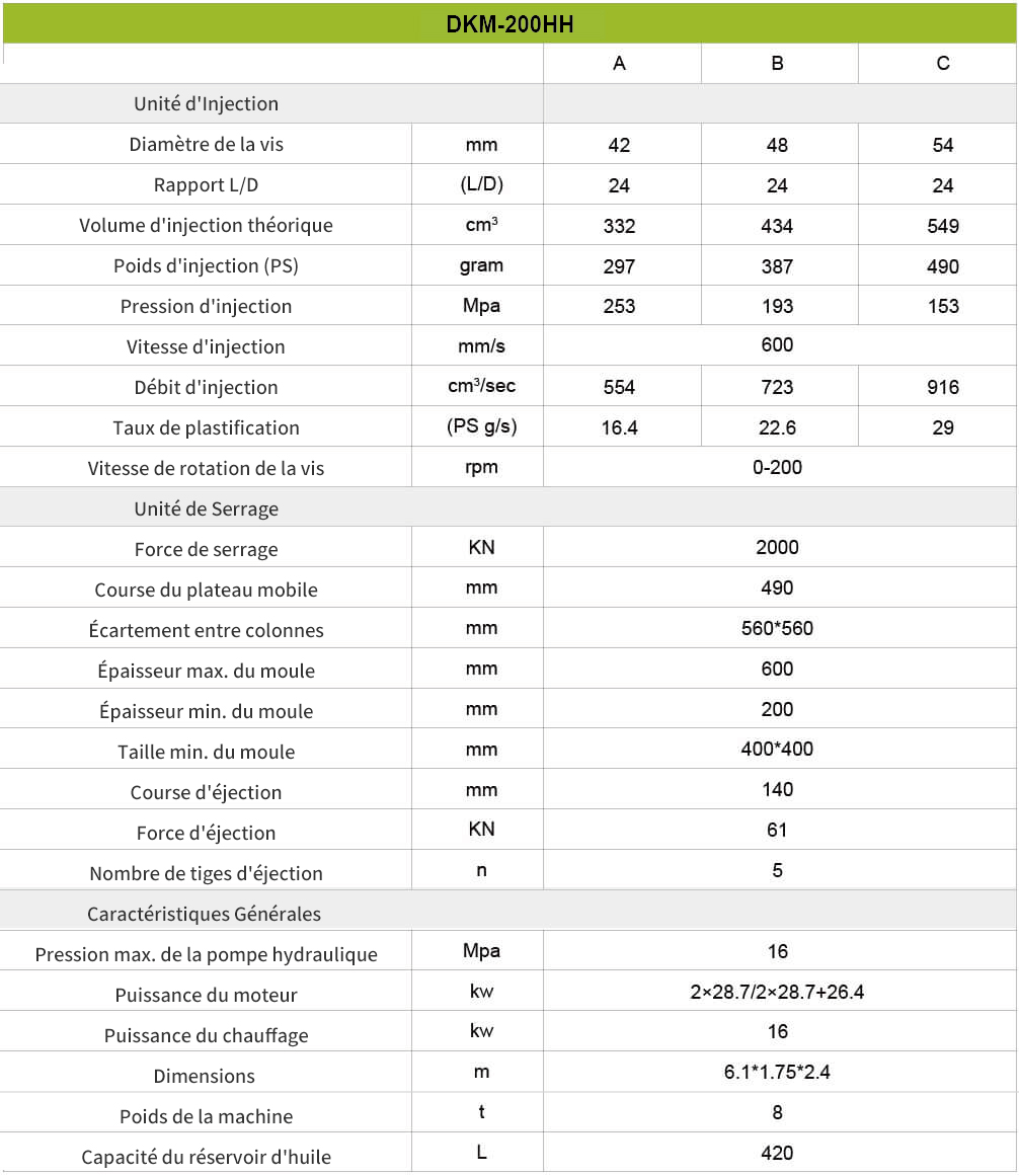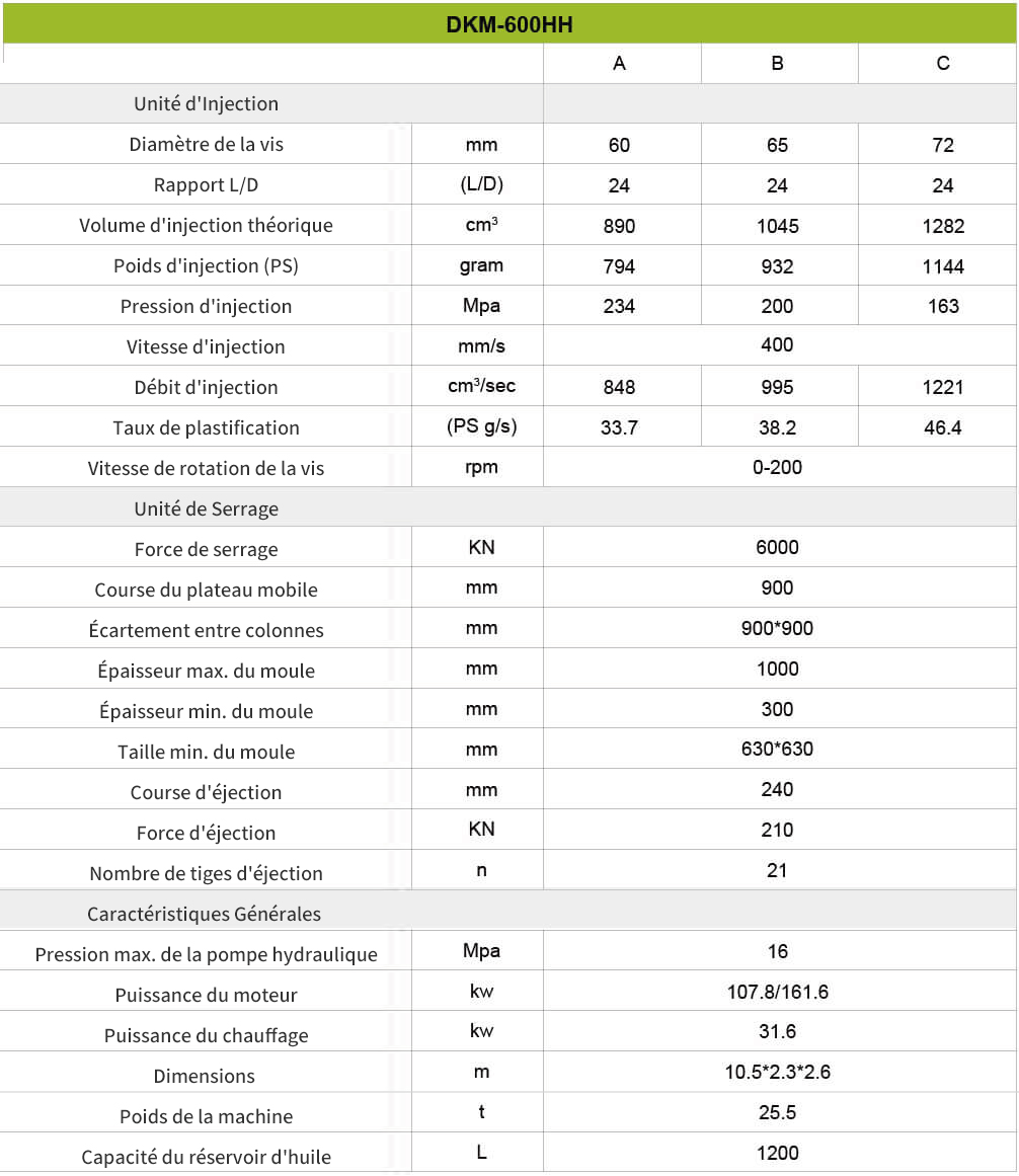 La série de machines de moulage à vitesse rapide DKM, allant de 200 tonnes à 1300 tonnes, offre une gamme de caractéristiques exceptionnelles qui les distinguent dans l’industrie. Ces machines sont conçues pour offrir des performances, une précision et une fiabilité exceptionnelles, garantissant des résultats optimaux pour vos besoins de moulage. Avec des temps de réponse très rapides, un contrôle de tolérance serré et une construction robuste, il permet une production rapide, une sortie de haute qualité et un fonctionnement ininterrompu. De plus, leurs options personnalisables vous permettent de vous adapter aux demandes changeantes du marché. Découvrez la puissance de DKM et élevez votre processus de moulage par injection à de nouveaux niveaux d’efficacité et de succès.