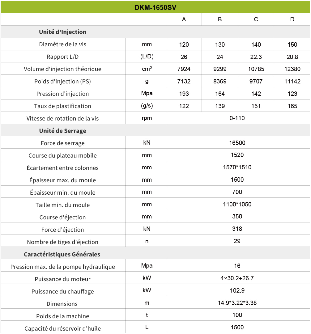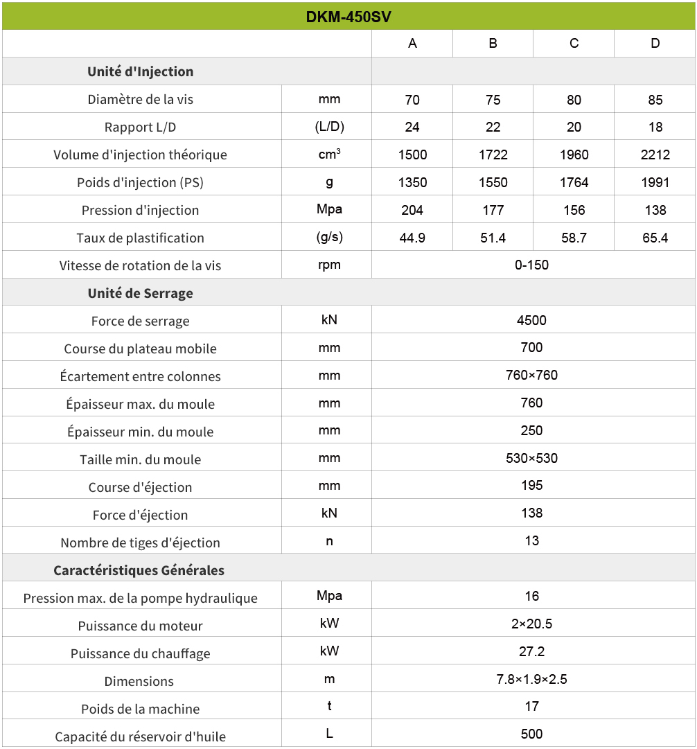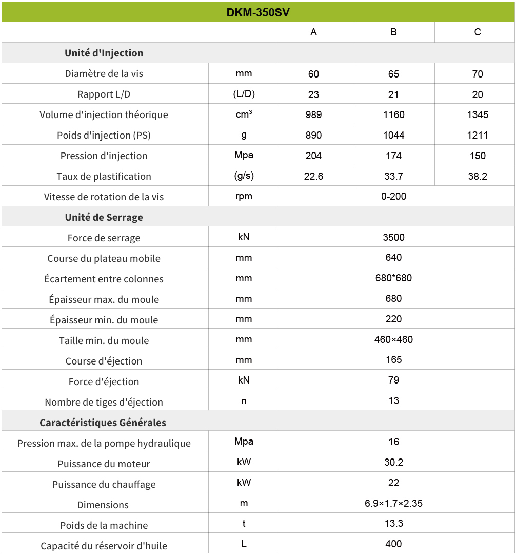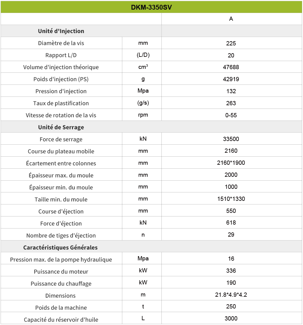 En conclusion, cette machine est un choix très avantageux pour les entreprises qui recherchent une technologie avancée, une polyvalence et une fiabilité dans leurs opérations de fabrication. Grâce à son large éventail d’options de tonnage, la machine peut répondre à différentes tailles de projet et offre une évolutivité pour la croissance future.L’intégration de technologies avancées, telles que les systèmes d’entraînement à servomoteur et les capacités d’injection à grande vitesse, assure des performances exceptionnelles, une efficacité énergétique et un contrôle précis. L’interface et les commandes conviviales rendent le fonctionnement intuitif et efficace, tandis que le support et le service complets de DKM garantissent une expérience fluide de l’installation à la maintenance continue.De plus, la rentabilité de la machine, ainsi que sa qualité durable, en font un investissement intelligent pour les entreprises qui visent à maximiser la productivité et la rentabilité. Dans l’ensemble, le choix de cette machine offre une solution fiable et efficace pour répondre aux besoins de production divers et réussir dans l’industrie manufacturière compétitive.